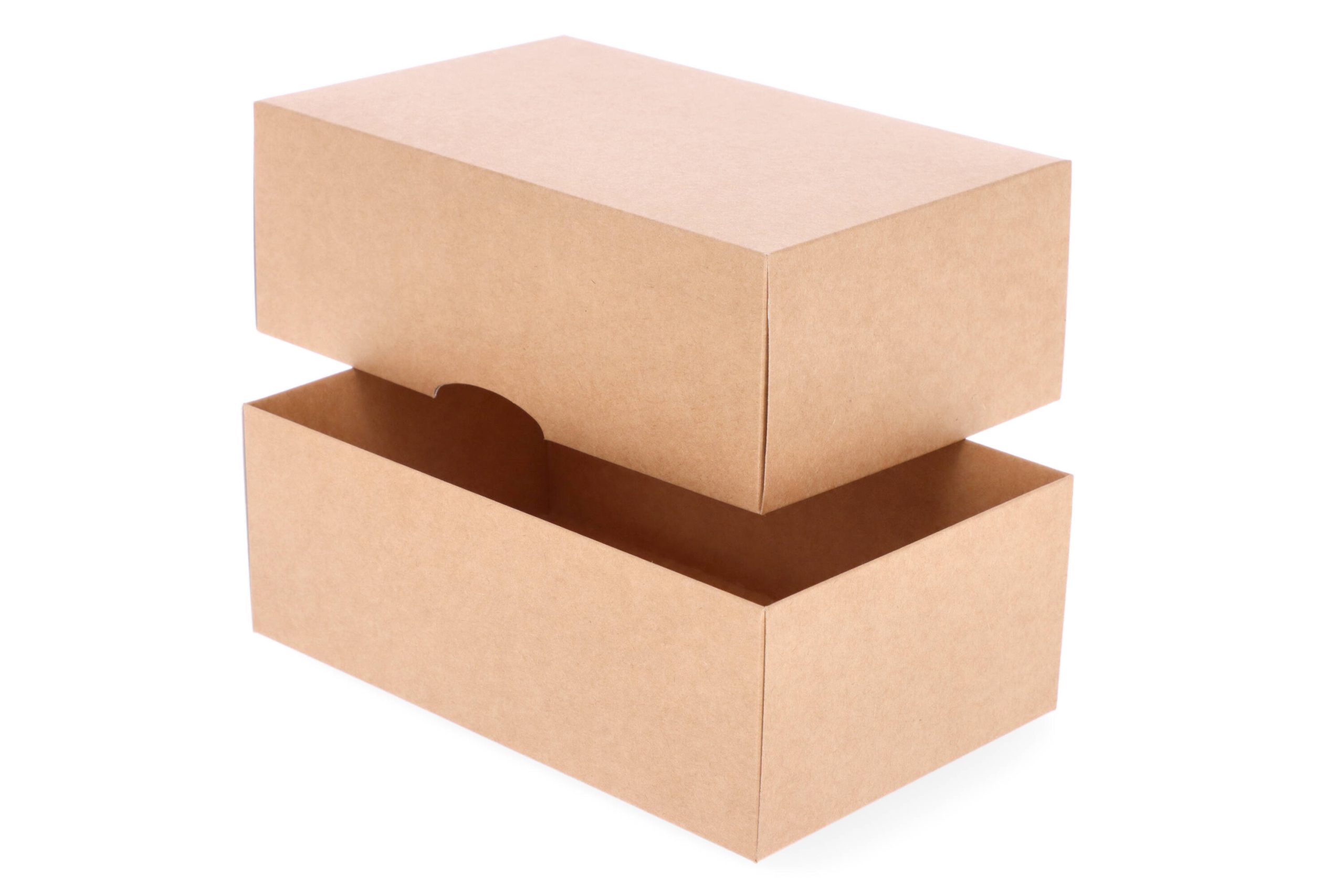 Dviejų dalių dėžės gaminamos iš 270 g storio dvispalvio rudos/baltos spalvos kartono.