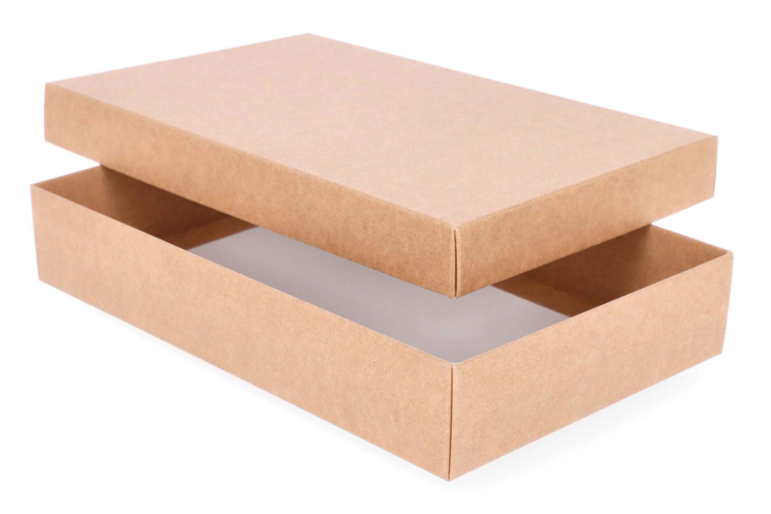 Dviejų dalių dėžės gaminamos iš 270 g storio dvispalvio rudos/baltos spalvos kartono.